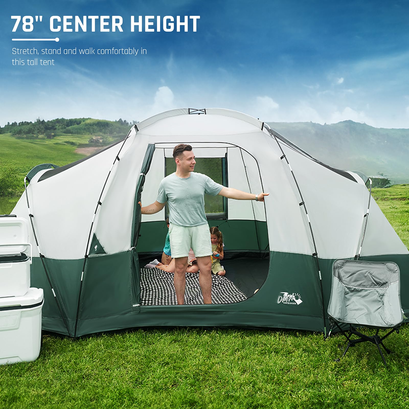 - Spacious Family Tent: Our large tent comfortably sleeps 11 people in a spacious 16 x 10 feet. Pre-curved Overhead fiberglass poles give the tent an impressive 78-inch center height. It's ideal for family camping trips, providing plenty of room for everyone to stretch out and relax.