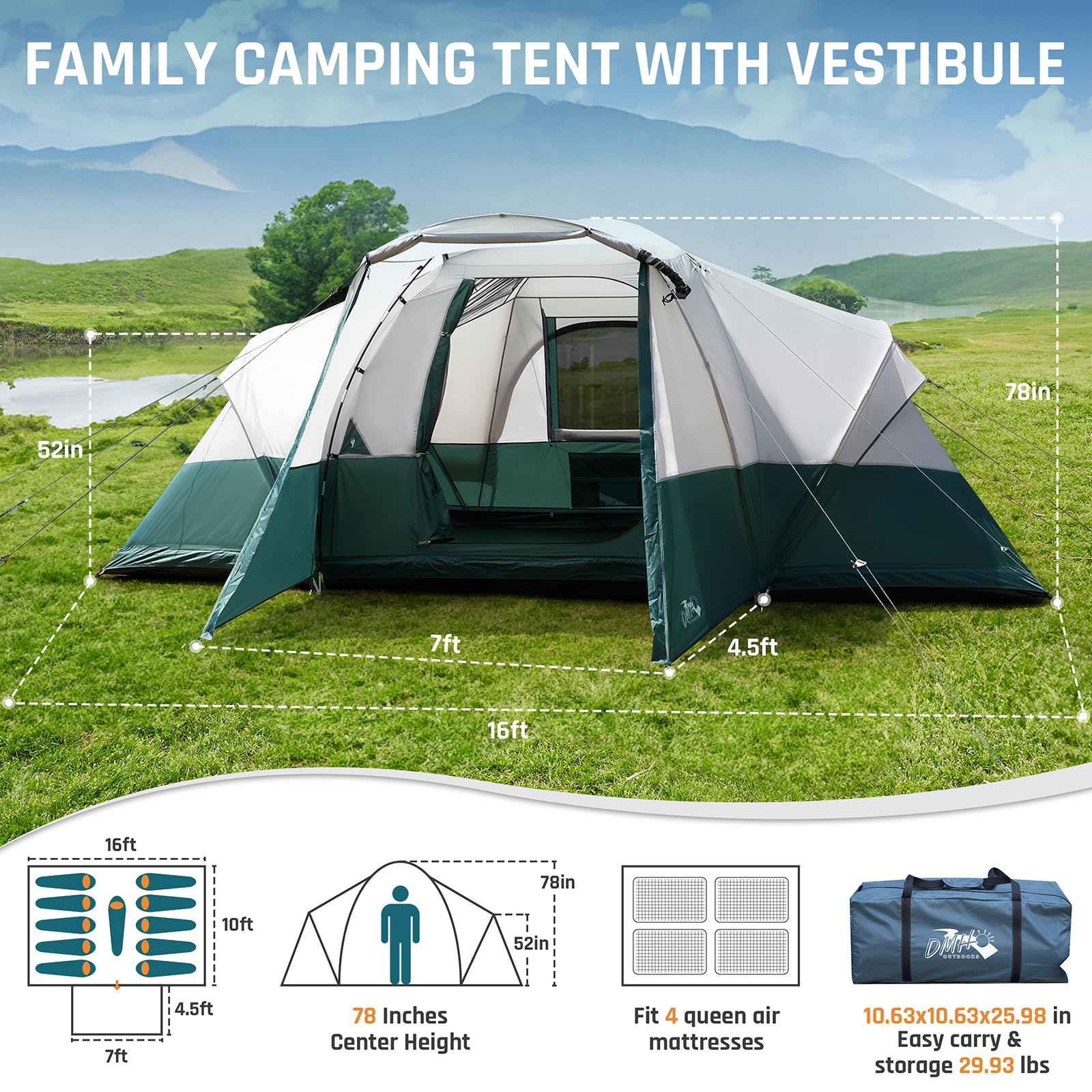 - 11 Person Camping Tent with Porch / Vestibule, 16'L x10'Wx78"H Large Family Tents for Camping, Tunnel Tent includes Rainfly and Carry Bag, Water Resistant Big Tent for Camping and Backyard