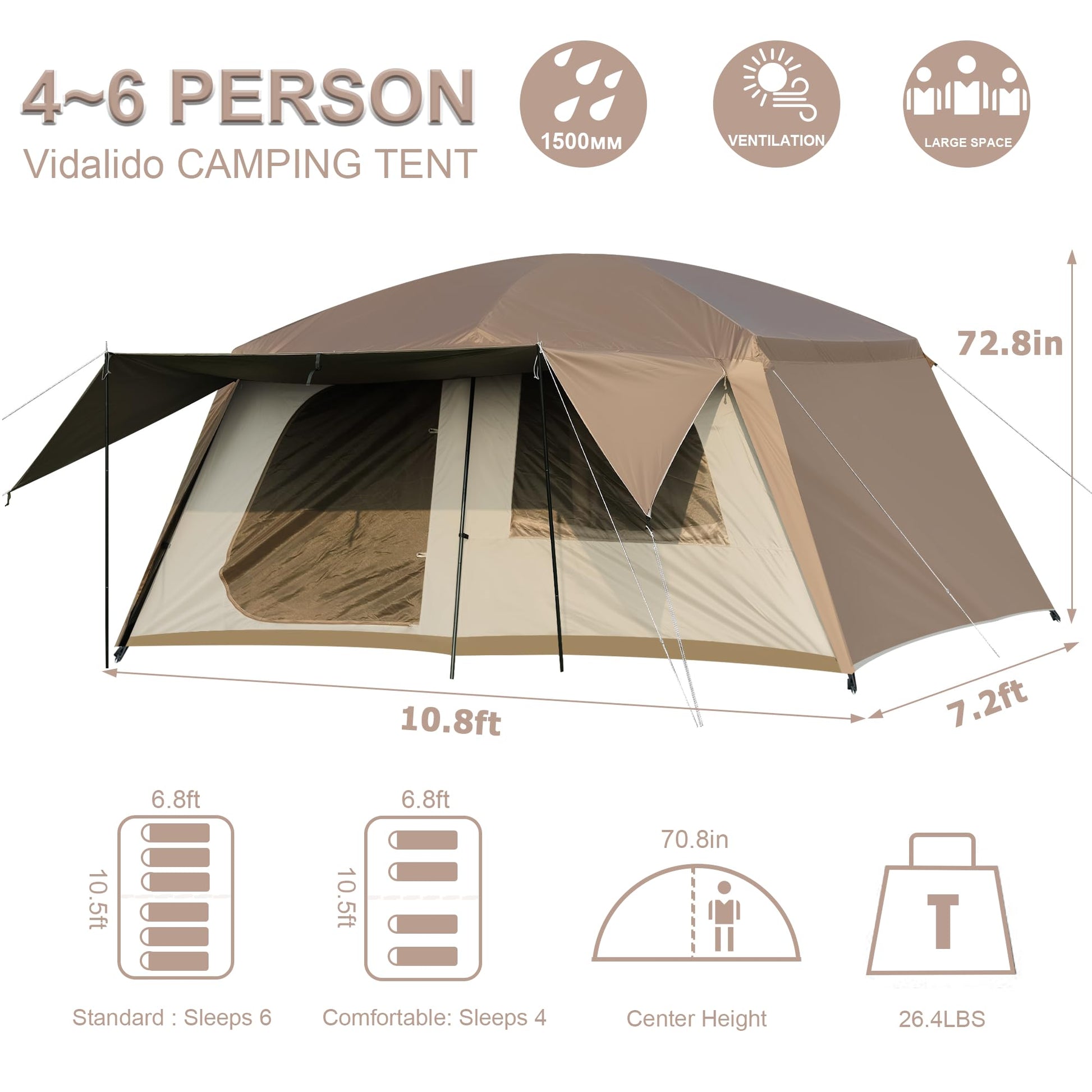 - ROOMY FOR 4-6 PERSON TENT: The tent is perfect for 4-6 person outdoor camping. With the size of 10.5ft x 6.8ft x 70.8in(H) (71.4 sq ft). 2 queen air mattresses (6.7ft*5ft/200cm*150cm, thickness below 7.8in) or 4-6 sleeping bags are well fit in the tent. Ideal for family outdoor camping.